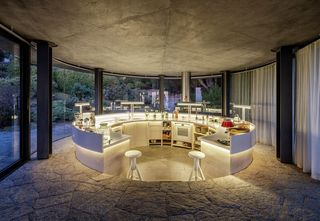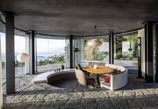 The suspended and bent Silent Gliss curtain track SG 6970 blends harmoniously into the glass pavillion. The sheer fabric provides privacy when needed.
