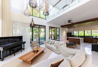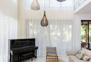 In this stunning villa, the 6.4-metre-high windows make a bold architectural statement and present a technical challenge. The solution? Silent Gliss cord operated curtain tracks.